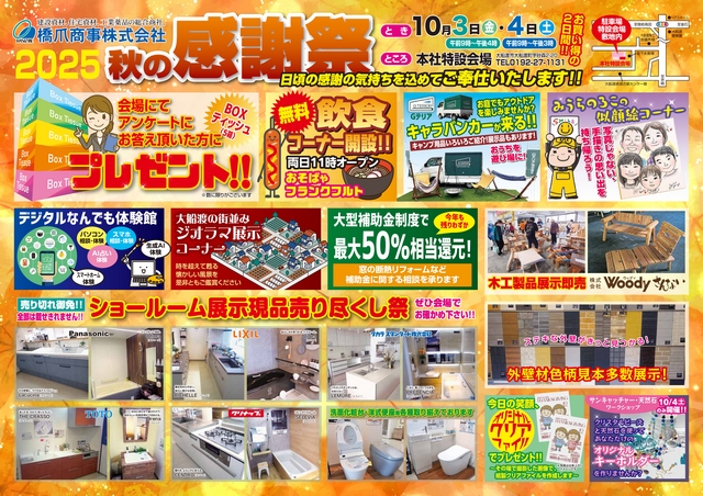 拝啓 益々ご清栄のこととお慶び申し上げます。平素は格別のご愛顧を賜り厚く御礼申し上げます。 今年度も感謝祭を開催する運びとなりましたので、ご案内申し上げます。 壁材・床材から水回りまでの住宅設備機器をはじめ金物工具の展示のほか、ワークショップなどもご用意しております。 またお蕎麦、フランクフルト、お飲み物をご用意して、皆様のご来場を心よりお待ち申し上げます。 敬具